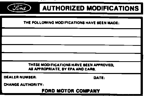 Obtain an Authorized Modifications Decal and list the date, dealer number, and summary of alterations performed. Select a prominent place adjacent to the Vehicle Emission Control Information Decal suitable for installing the Authorized Modifications Decal. Clean the area, install the decal, and cover it with a clear plastic decal shield.
