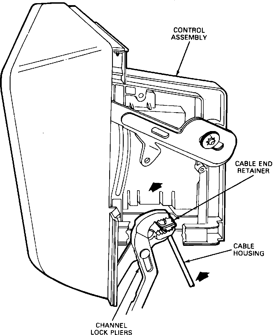 4. Using suitable pliers, compress function control cable end retainer, then pull cable in direction shown, Fig. 10, until cable flag can be disconnected from control assembly.
