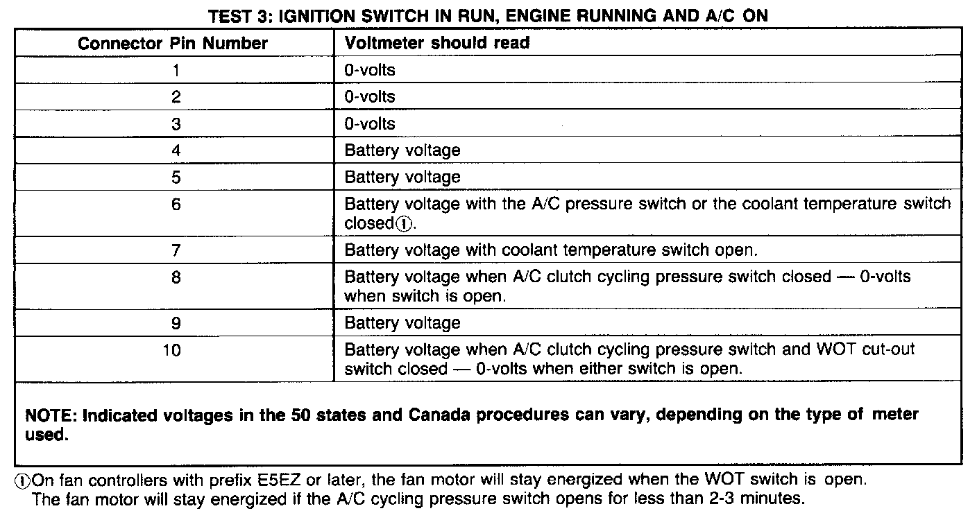 If it is suspected that the cooling fan controller is not operating properly, diagnosis of the controller can be performed by taking voltage/continuity readings at the controller connector with the connector plugged into the controller. The readings should be made during the following three tests: