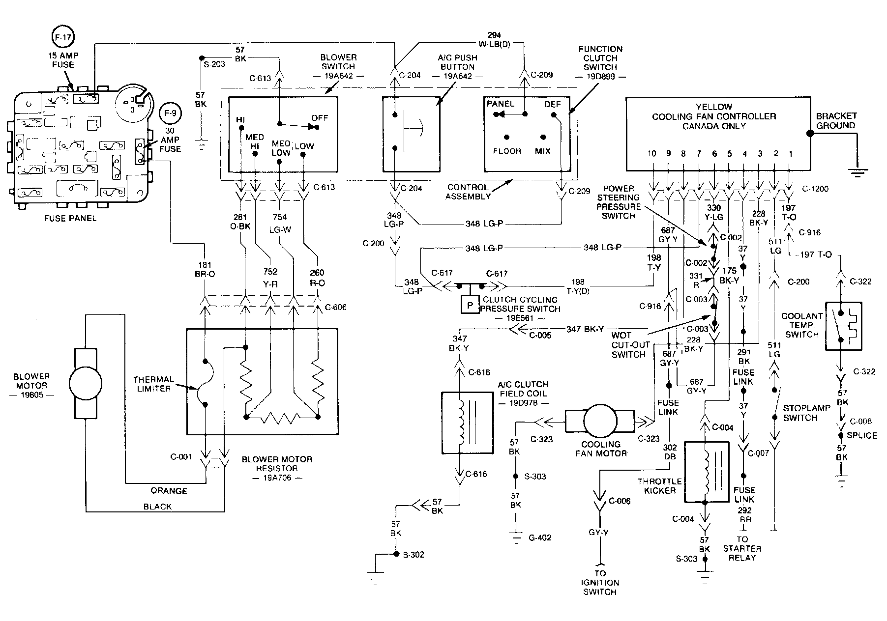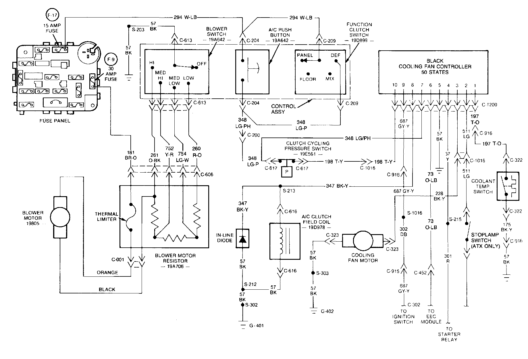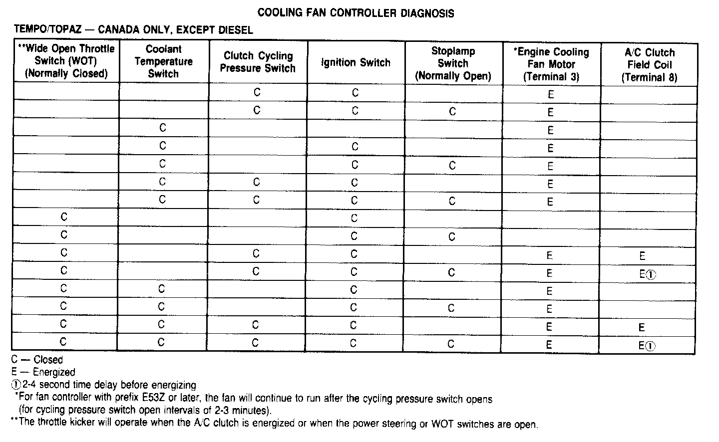 Each cooling fan controller has the part number stamped on the housing or on the mounting bracket to identify the controller. It is important that the correct controller be installed for proper operation. Locate the correct cooling fan controller diagnosis procedure and wiring diagram. Then, determine the position (open or closed) of each switch in the system (listed at top of diagnosis chart). Then, locate the appropriate row of the diagnosis chart to correspond with the switch positions. Follow the row to the right to determine if the letter F appears in that row. An E in the column at the right indicates that the component listed at the top of that column should be energized for the switch positions.