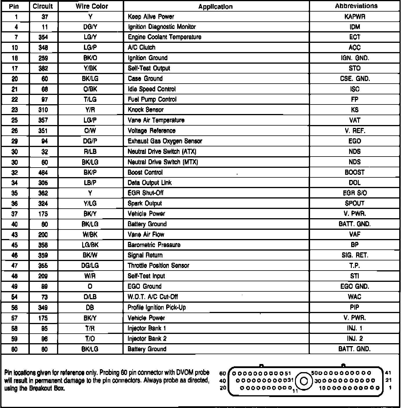 Fig. 218 EEC-IV module connector pin usage. 1986 Cougar XR-7 & Thunderbird W/4-140 turbocharged EFI engine: