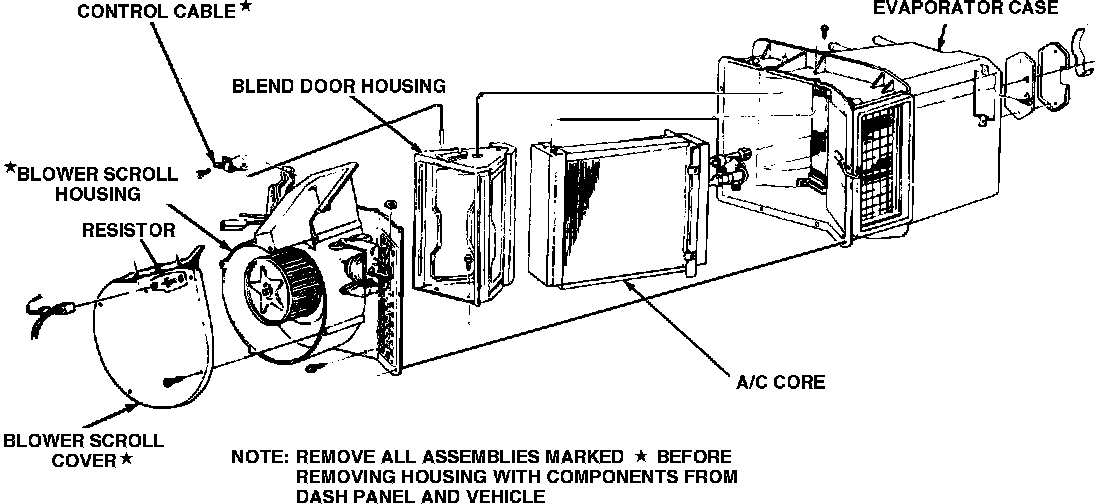 3. Disconnect control cable from evaporator housing. Remove A/C blower housing.