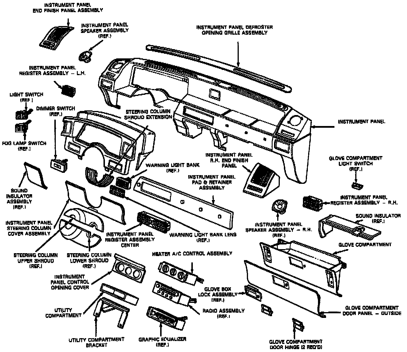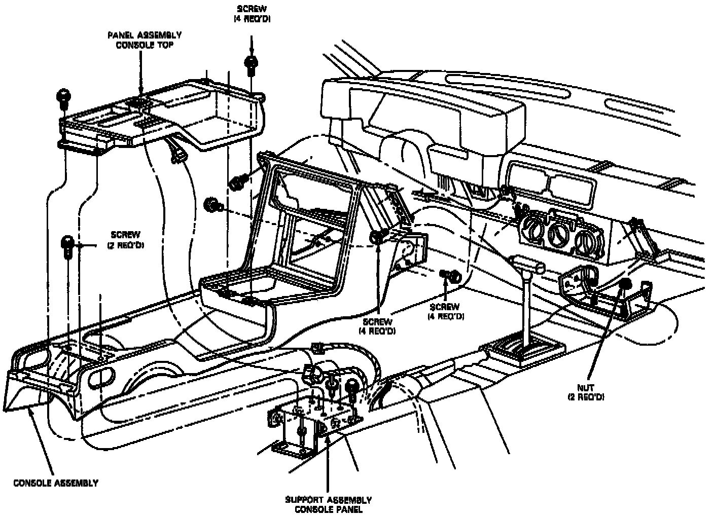 - The floor console assembly attaches to these supports as well as to the instrument panel at Its upper, forward end. A console top panel assembly attaches to the console at the forward end of the top panel and through the console to the support assembly at its rear end.