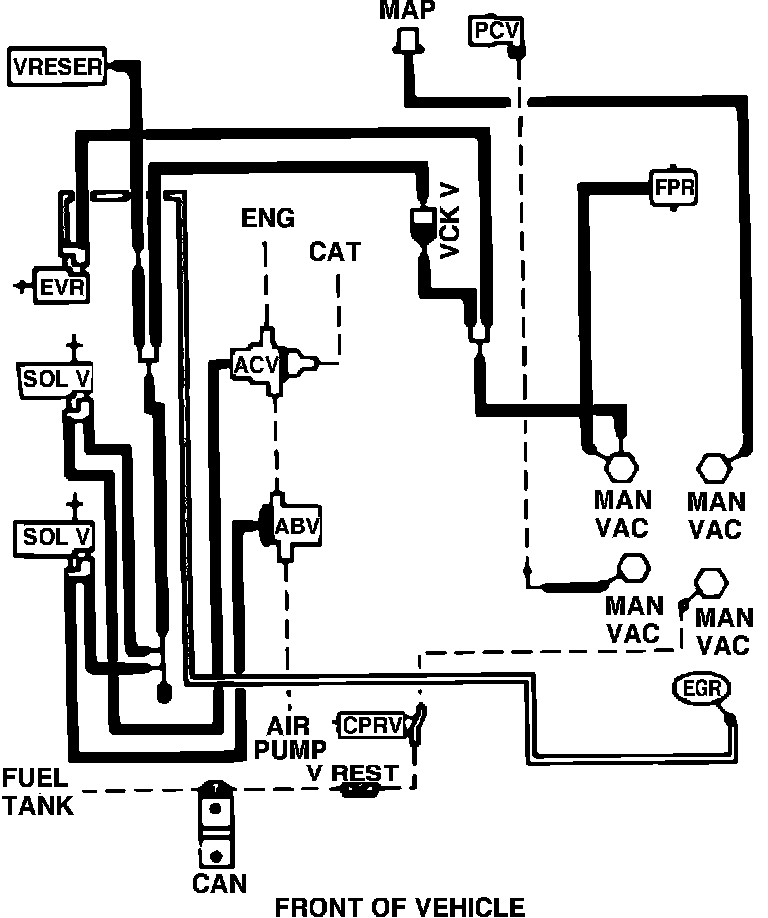 Fig. 11 Vacuum hose routing. 1987 V8-302 w/EFI, exc. calib. codes 7-21A-R05, 7-21C-R05, 7-21P-R05, 7-22A-R00, 7-22D-R00, 7-22P-R00 7-22R-R00 & 7-23D-R00: