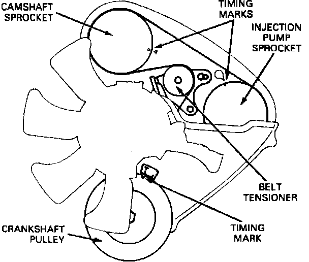 3. Check that crankshaft pulley, injection pump sprocket and camshaft sprocket are aligned properly with their timing marks, Fig. 13.