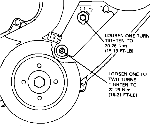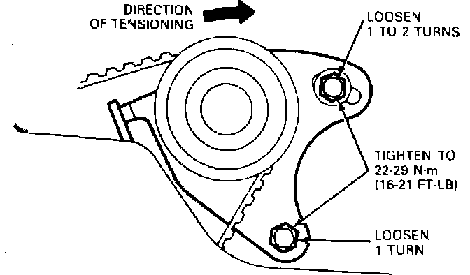 4. Tighten bottom tensioner bolt to 16---21 ft. lbs., then tighten top bolt to 15---19 ft. lbs. Tighten the bottom bolt first. Tightening the top bolt first can cause the tensioner to rotate and over-tighten the timing belt.