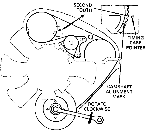 Fig. 15 Aligning pointer on timing cover with second tooth from alignment mark on camshaft sprocket: