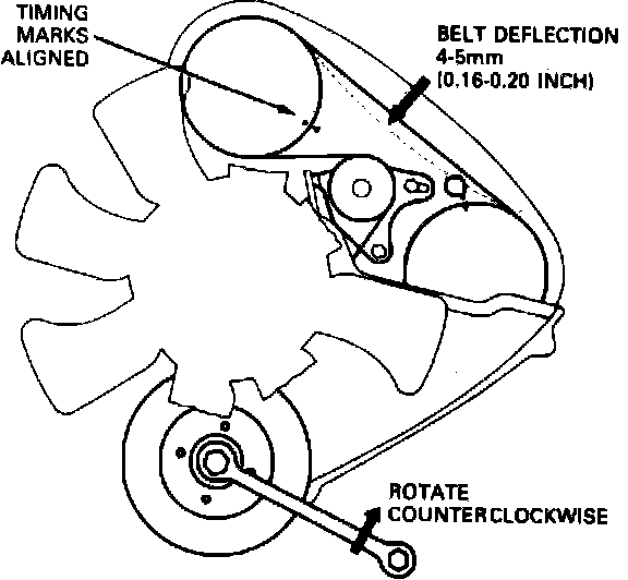 7. Rotate crankshaft counterclockwise until timing marks are aligned, Fig. 16. Push belt downward halfway between injection pump sprocket and camshaft sprocket, then check deflection. If belt is properly tensioned, belt should deflect .16---.20 inches.