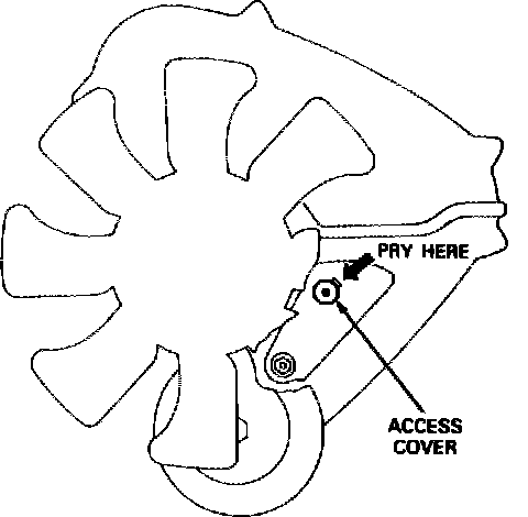 2. Remove access cover for top belt tensioner bolt by inserting a suitable screwdriver in slot shown in Fig. 17 and prying outward.