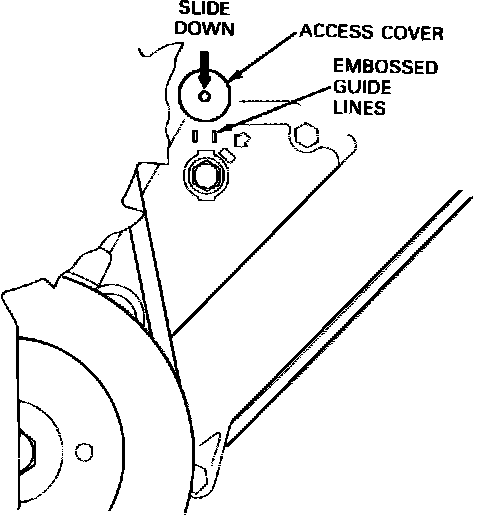 5. Install access cover for top tensioner bolt by sliding downward along the two guide lines embossed on the front lower cover, Fig. 19.