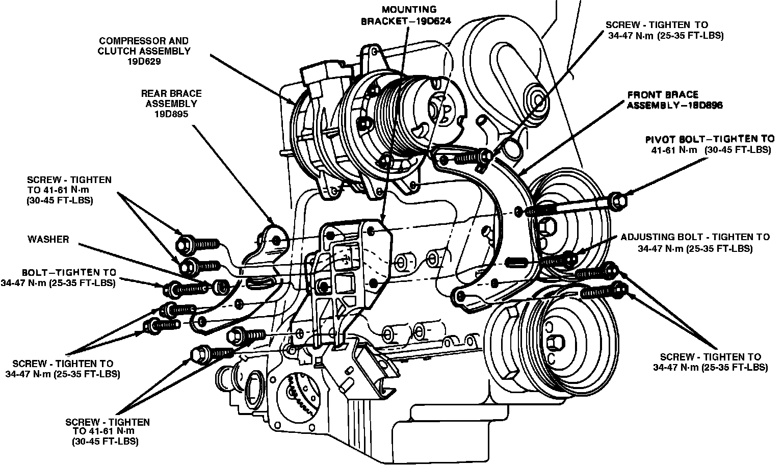 6. Remove pivot bolt and remove compressor with front and rear braces attached from mounting bracket and vehicle.
