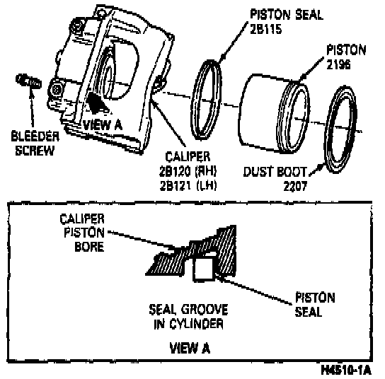 1. Apply a film of clean brake fluid to the new caliper piston seal, and install it in the cylinder bore. Be sure the seal does not become twisted but is firmly seated in the groove.