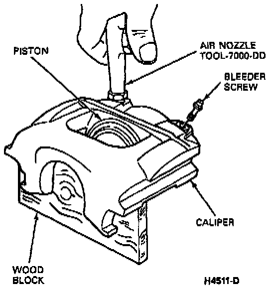1. Remove the caliper assembly. Place a block of wood over the piston before applying air pressure to prevent damage to the piston.