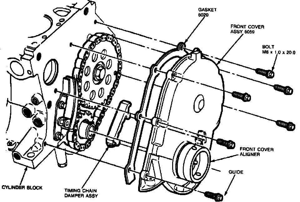 10. Install front cover bolts. Torque bolts to 6-9 ft. lbs., then remove front cover alignment tool.