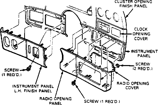 10. Remove radio opening finish panel attaching screw (in lower part of panel), then, remove radio finish panel by snapping out.