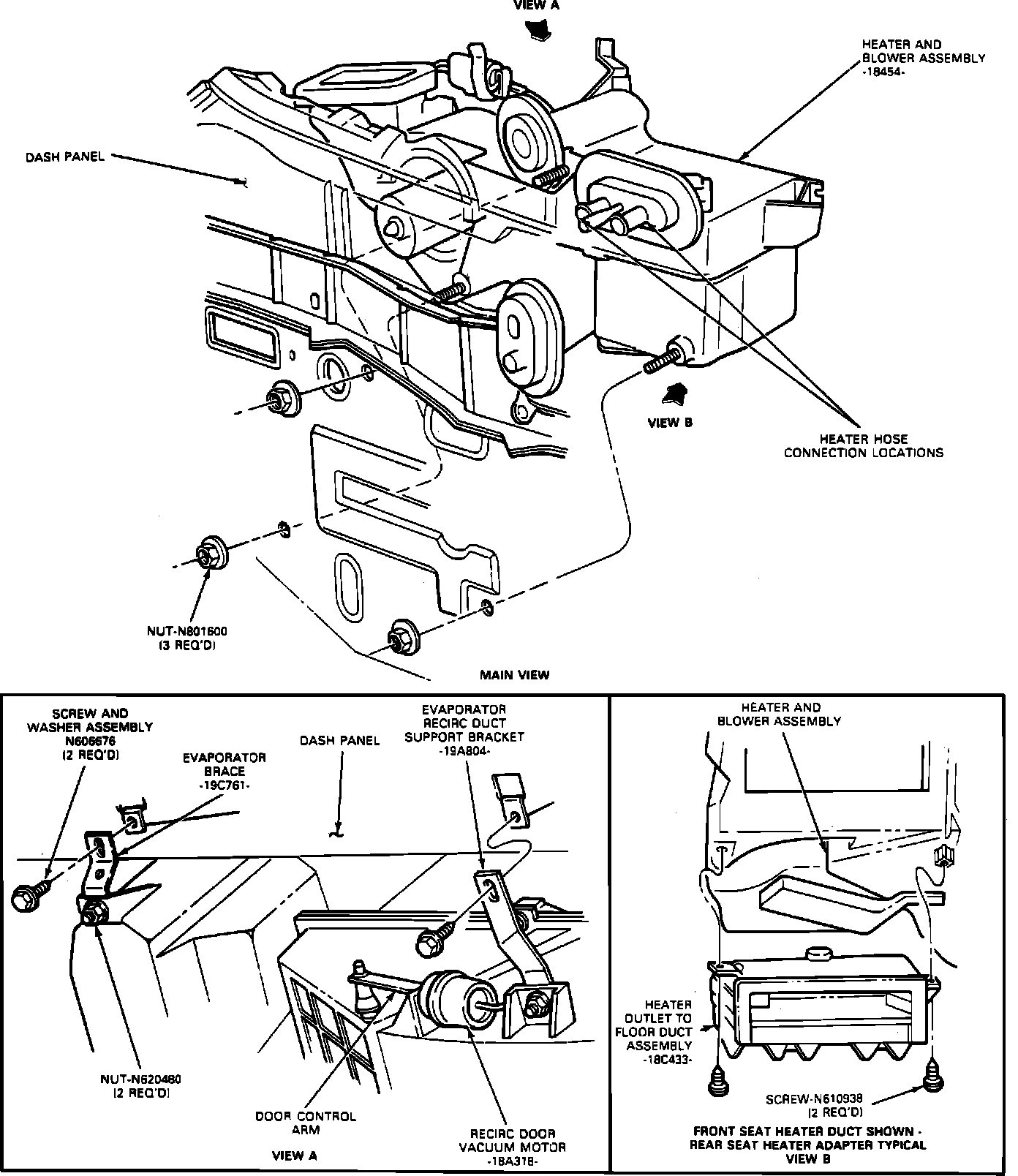20. Remove floor register or rear seat adapter to heater case attaching bolts, then the floor register.