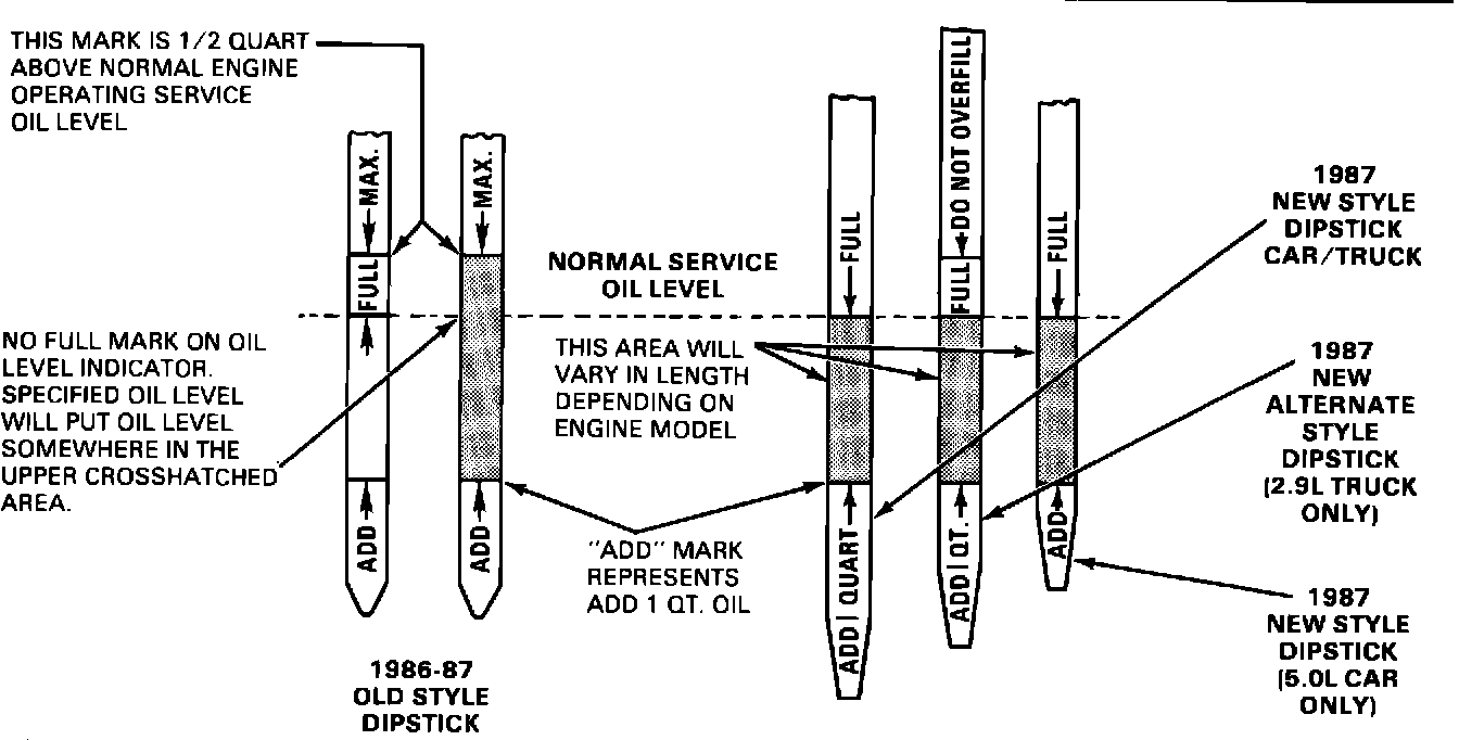 ACTION: Do not fill engine oil to the "MAX" oil level line marked on the dipstick. The "MAX" line represents a tolerance limit that is about 1/2 quart above the specified (normal) engine oil operating level. A correctly filled engine should show an oil fill level reading in the crosshatched area of the dipstick, Figure 4. During new vehicle delivery or right after an oil change, the oil fill reading should be at the full mark on the new style dipstick and in the upper crosshatched area on the old style dipstick. Refer to the following specification chart for proper fill requirements.