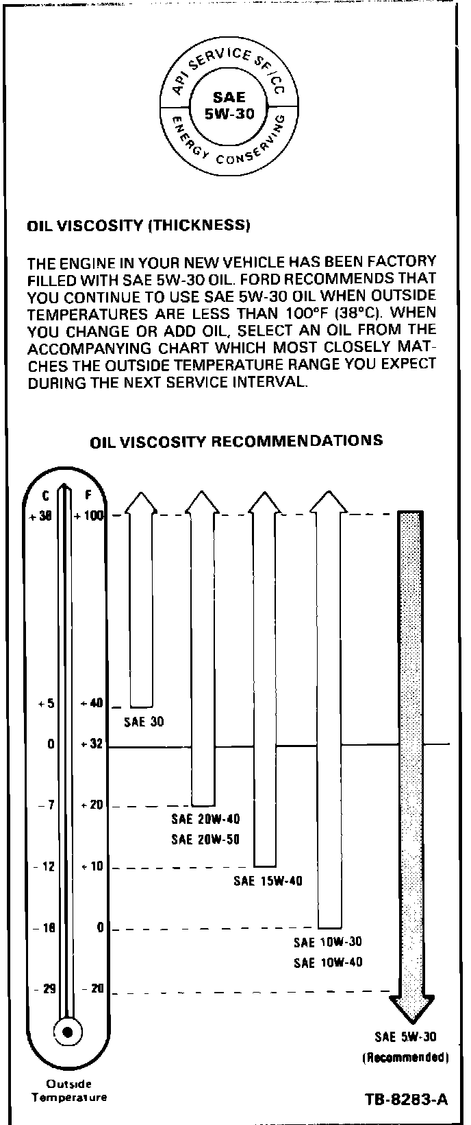 In these engines, SAE 5W-30 oil is the recommended viscosity for operating conditions up to 100~F (38~C) ambient temperature. In addition to selecting the proper viscosity grade (Figure 13), it is very important that the oil meets other minimum performance requirements. The Company recommends that Motorcraft oil or an equivalent oil that meets Ford Specification ESEM2C153-C and API (American Petroleum Institute) categories SF or SF/CC or SF/CD, be used in gasoline engine powered vehicles.