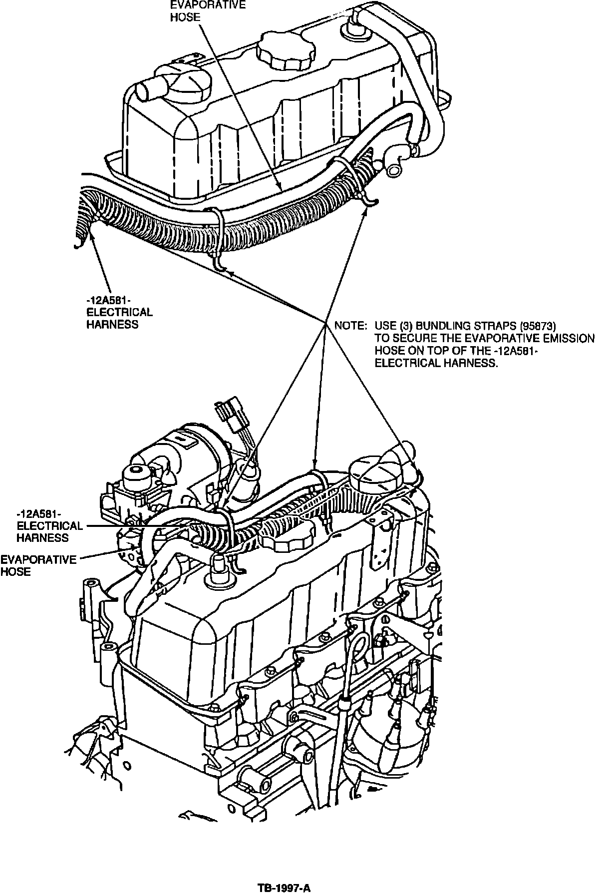 b. Reroute the hose on top of the -12A581- electrical harness.