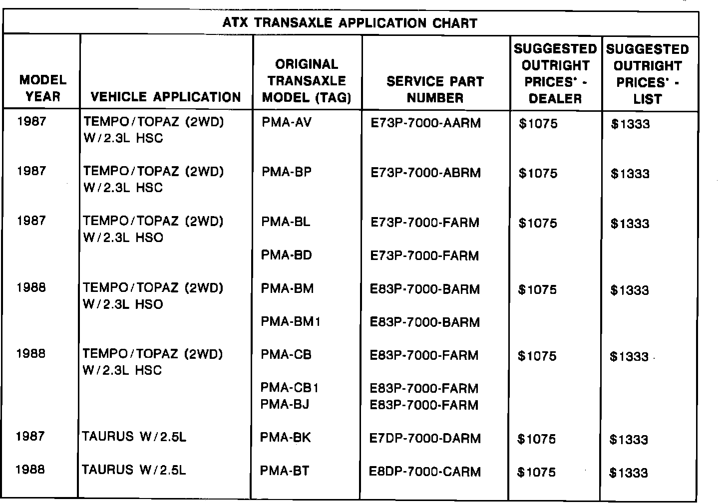 Refer to the ATX Transaxle Application Chart for application information, part numbers, and prices.