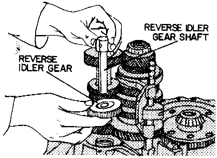 10. Engage reverse idler gear groove with pin at end of reverse relay lever, then slide shaft through gear and into bore.
