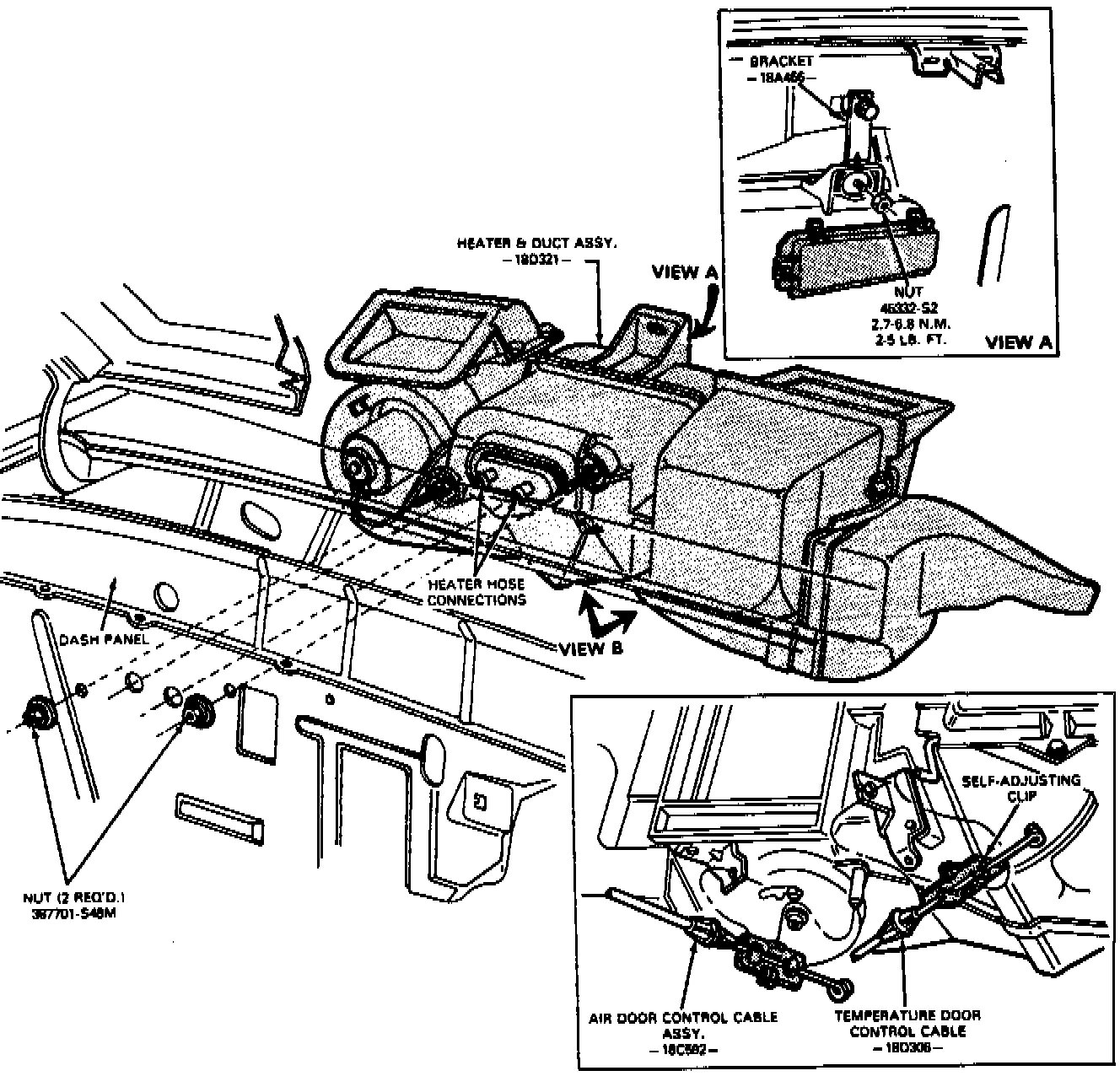 7. Working in the engine compartment, loosen the two nuts attaching the heater case assembly to the dash panel.