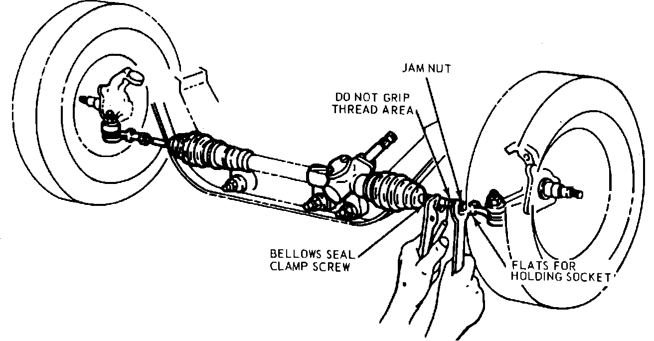4. Use suitable pliers to turn the tie rod inner end to correct the adjustment to specifications. Do not use pliers on tie rod threads. Turning to reduce number of threads showing will increase toe-in. Turning in the opposite direction will reduce toe-in.