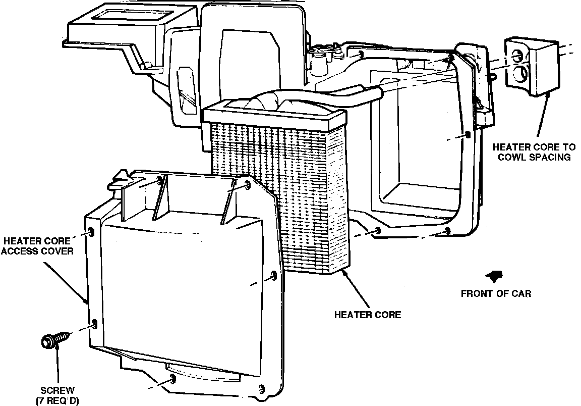3. Remove screws retaining heater core cover to plenum and remove cover.