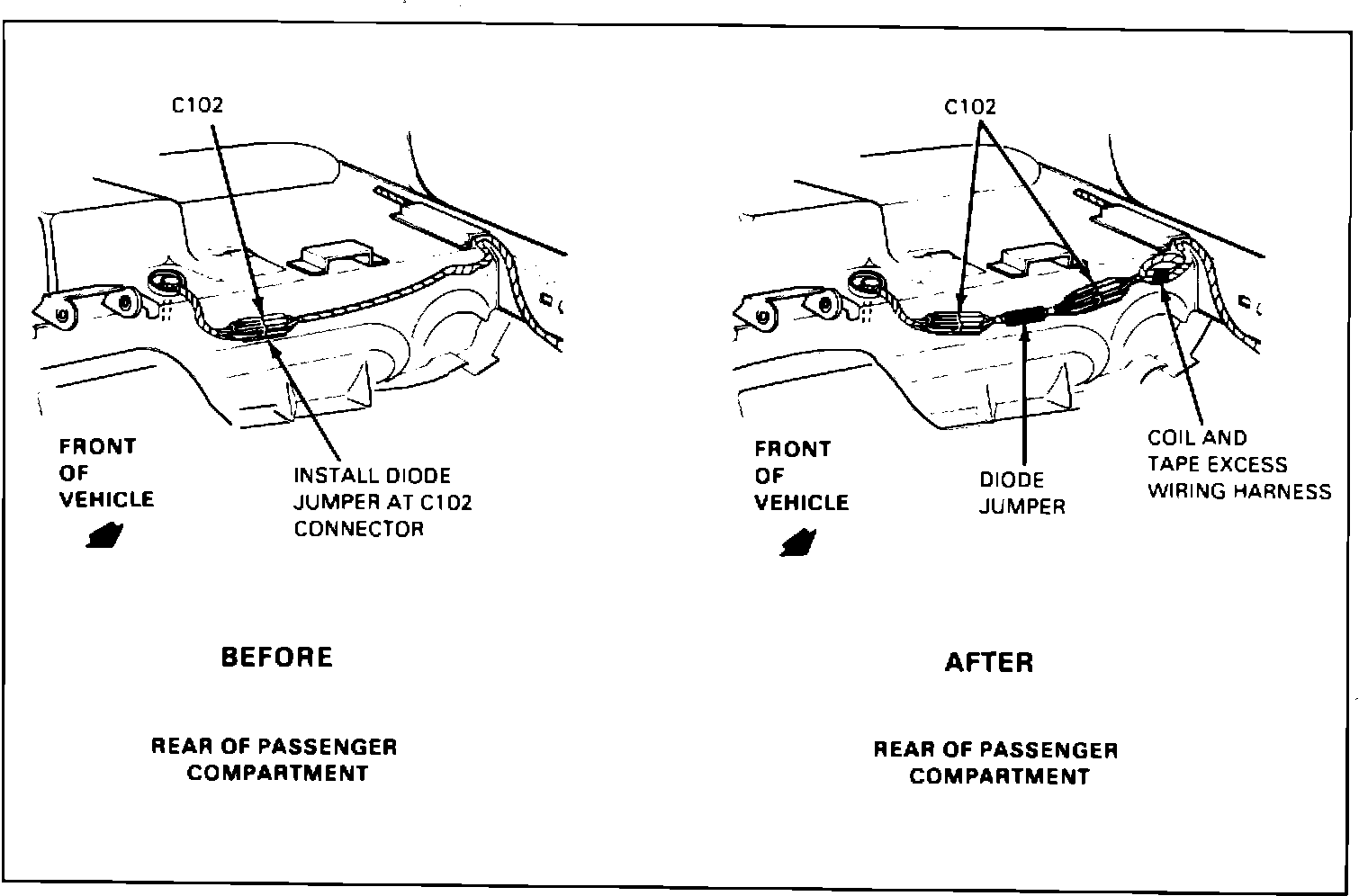 6. Secure locator on diode jumper to floor pan hole where connector C102 was previously located. Pull all harness slack toward left hand (drivers) side of car, coil the extra harness and tape it.