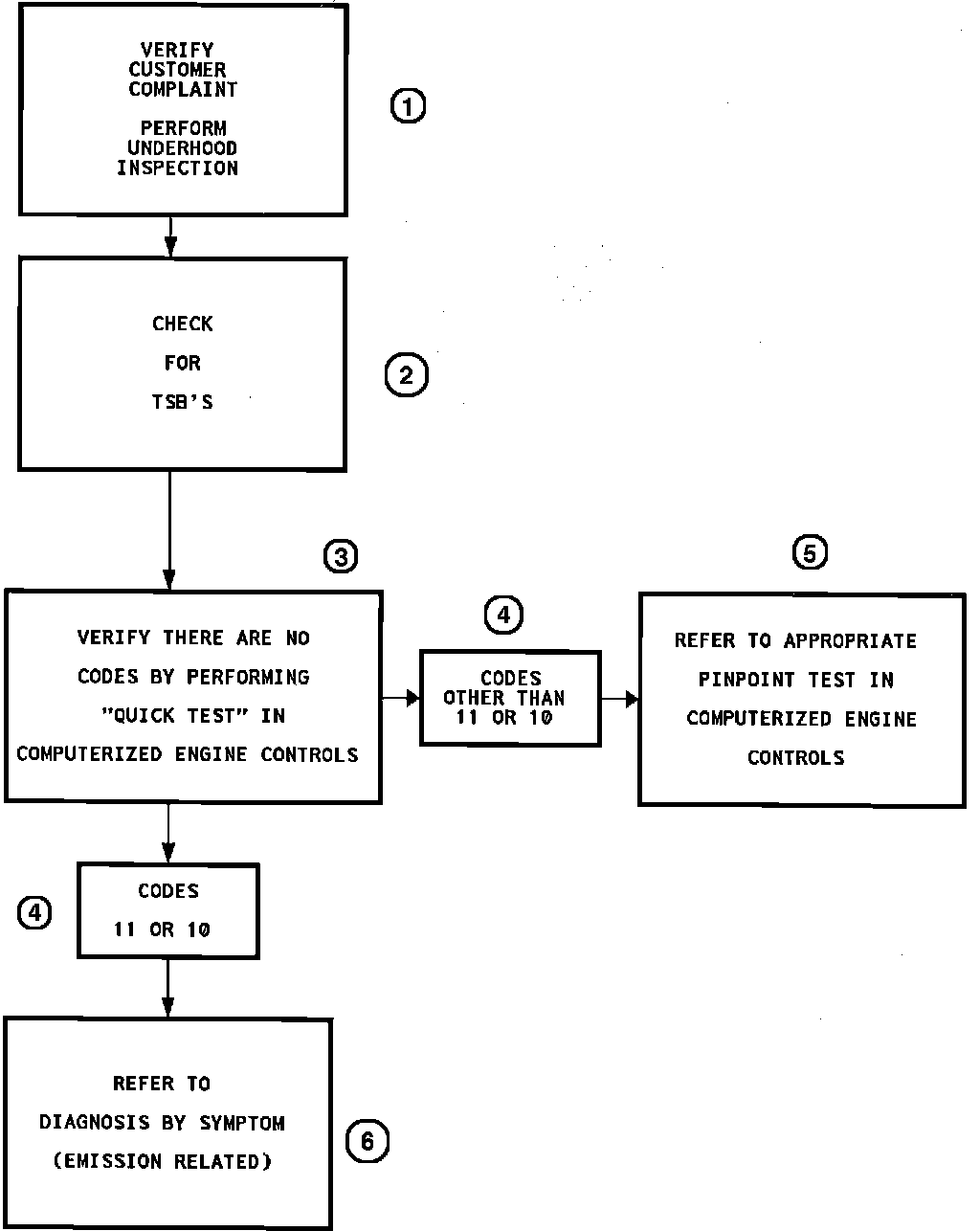 6 See DIAGNOSIS BY SYMPTOM - EMISSION RELATED under TESTING PROCEDURES for symptom vehicle is exhibiting. Follow the procedures as outlined for given symptom.