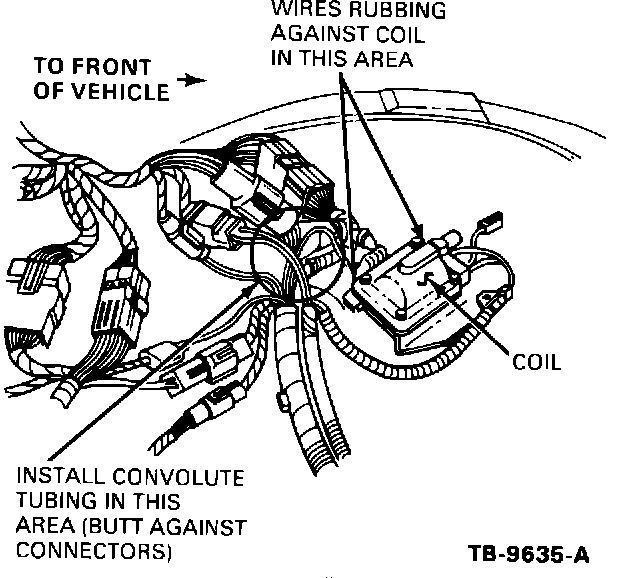 ACTION: To correct this, install a piece of convolute tubing on the 12A581 wire harness. Refer to the following service procedure.