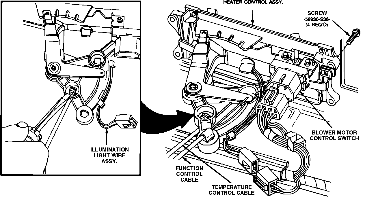 9. Rotate control assembly 90°, disconnect temperature control cable from temperature control lever, then remove control assembly from instrument panel.