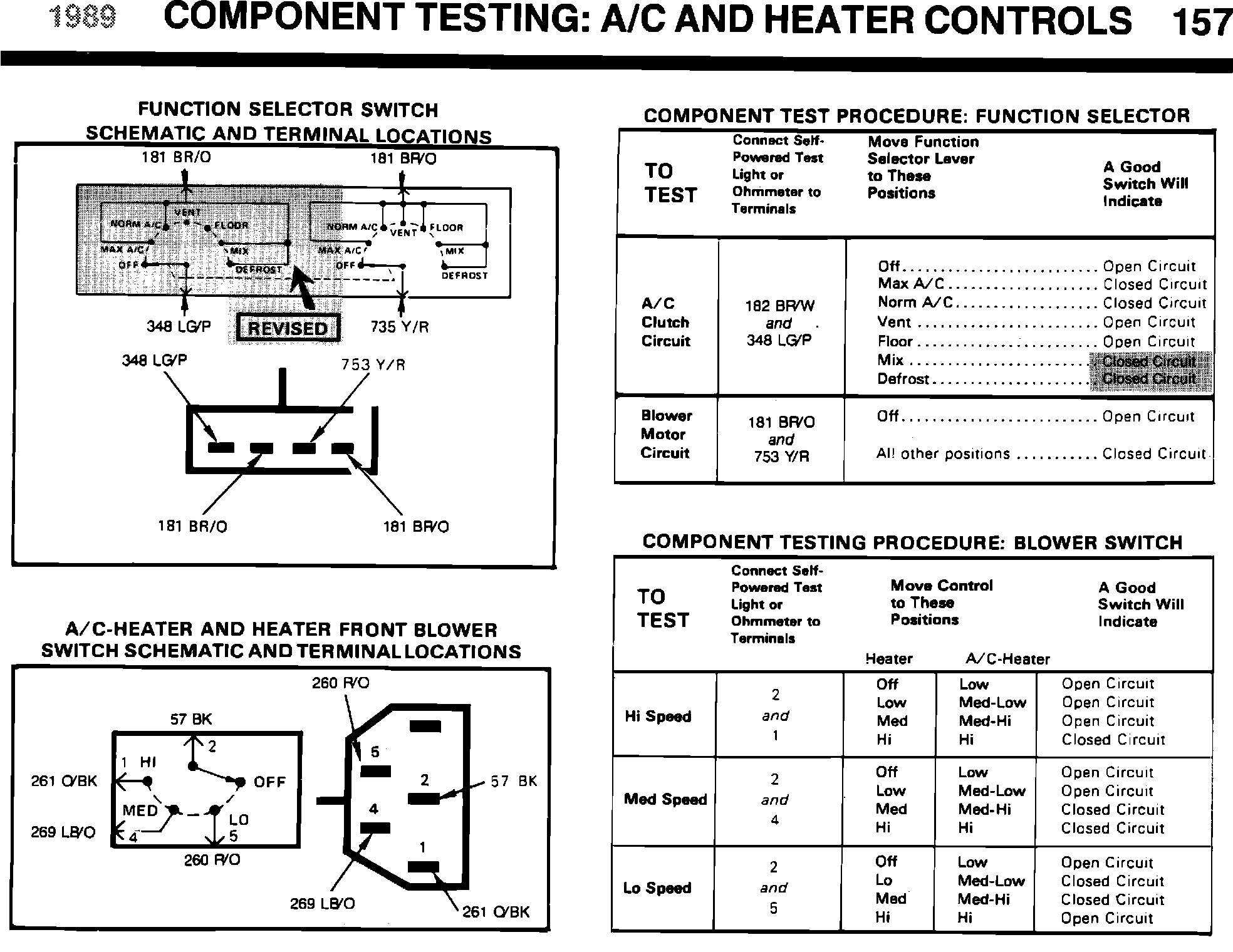 ISSUE: The schematics which show the Function Selector Switch on pages 92 and 151 in the 1988 EVTM and pages 84 and 157 in the 1989 EVTM, do not indicate operation of the A/C clutch in the Mix and Defrost modes. The 1989 schematics do not properly label the Clutch Cycling Switch or show the correct 348 circuit.
