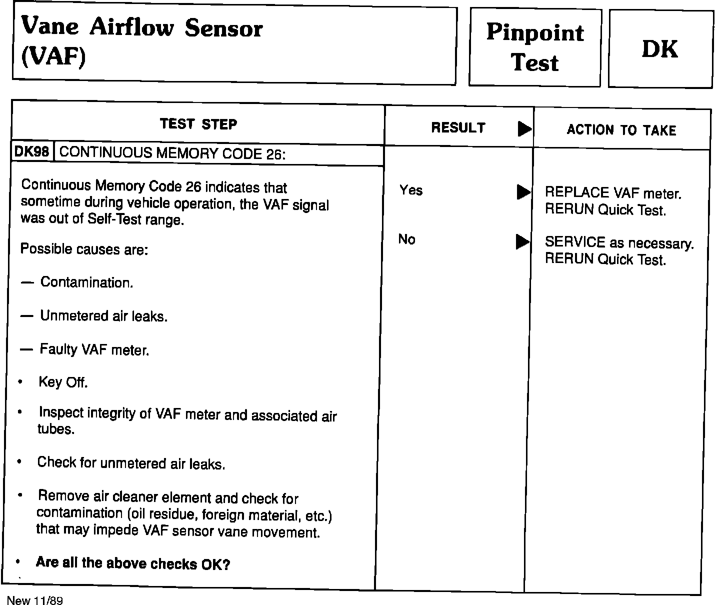 ENGINE/EMISSIONS DIAGNOSIS SHOP MANUAL, VOLUME H - 1989 - SECTION 17 - NEW CONTINUOUS CODE 26 FOR VANE AIR FLOW (VAF) SENSOR PINPOINT TEST DK
