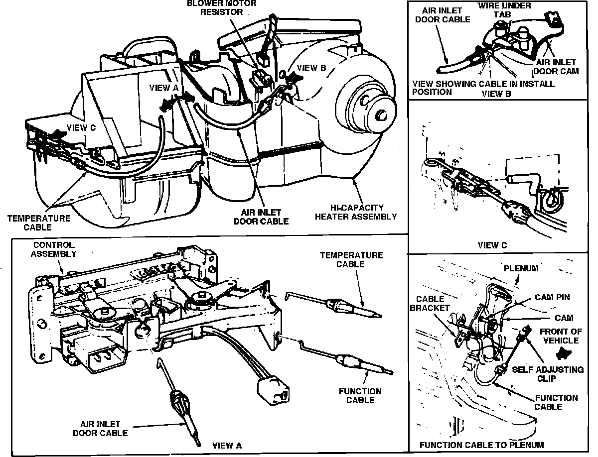 2. Move Temperature control lever to Cool position. Using control cable removal tool, disconnect temperature control cable housing and retainer from the A/C case bracket, then disconnect cable from temperature door crank arm.