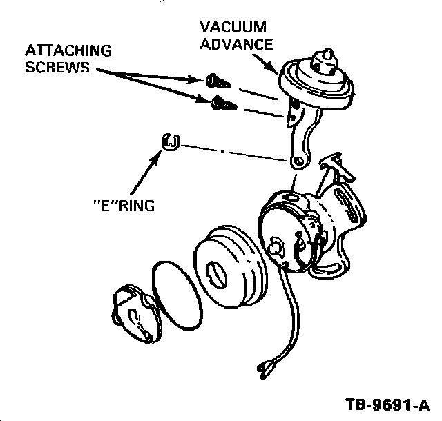 11. Remove the "E ring" clip and two (2) screws holding the vacuum advance to the distributor housing and distributor plate, Figure 14.