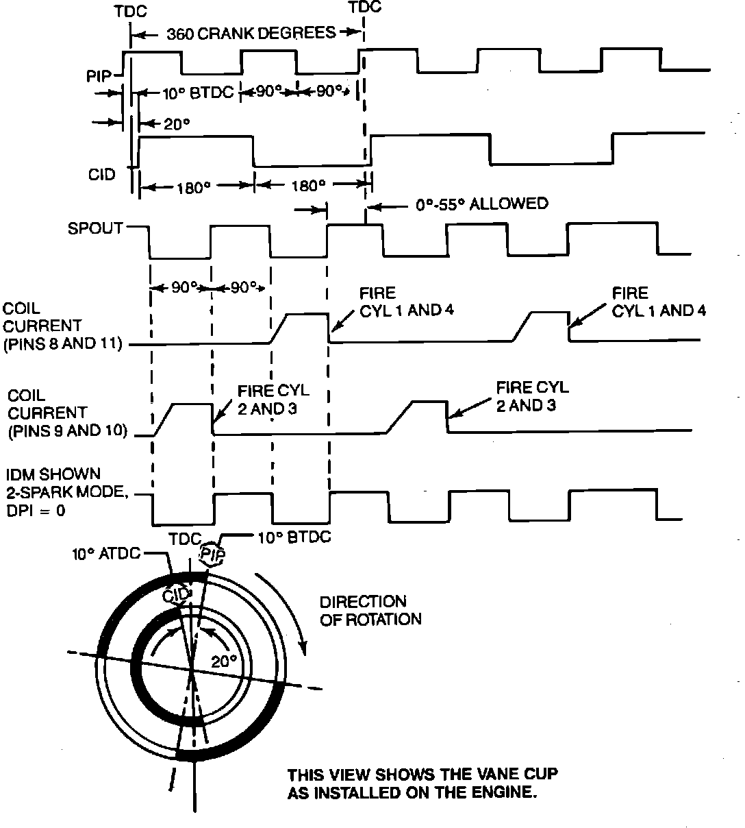 The EEC-IV processor determines spark angle using the PIP signal to set base timing. Spout is sent from the processor to the DIS module and serves two purposes: The leading edge fires the coil and the trailing edge controls the dwell time. This feature is called CCD or Computer Controlled Dwell.