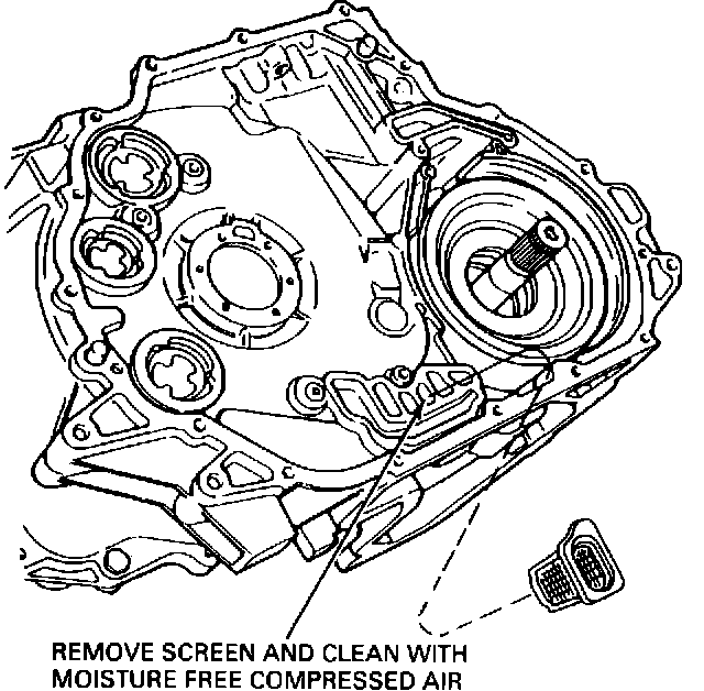 ACTION: If the chain cover is removed for service, remove the filter and clean the screen with moisture-free compressed air before reinstalling it, Figure 1. Under normal operation, the filter will last the life of the transaxle. If the filter is lost or damaged, replace it with a new filter E9DZ-7H162-A.
