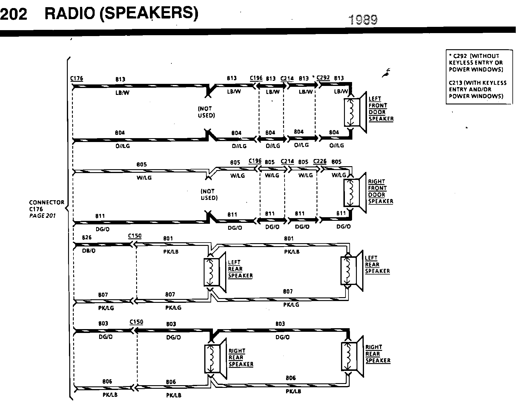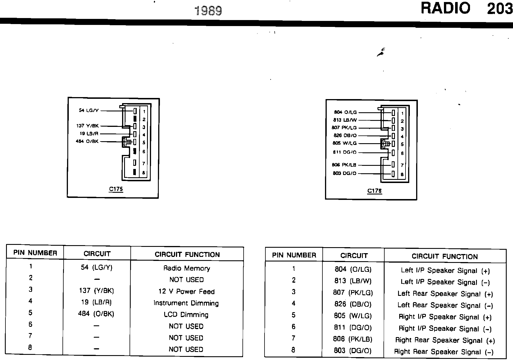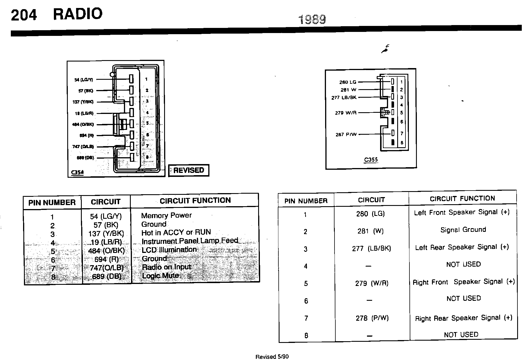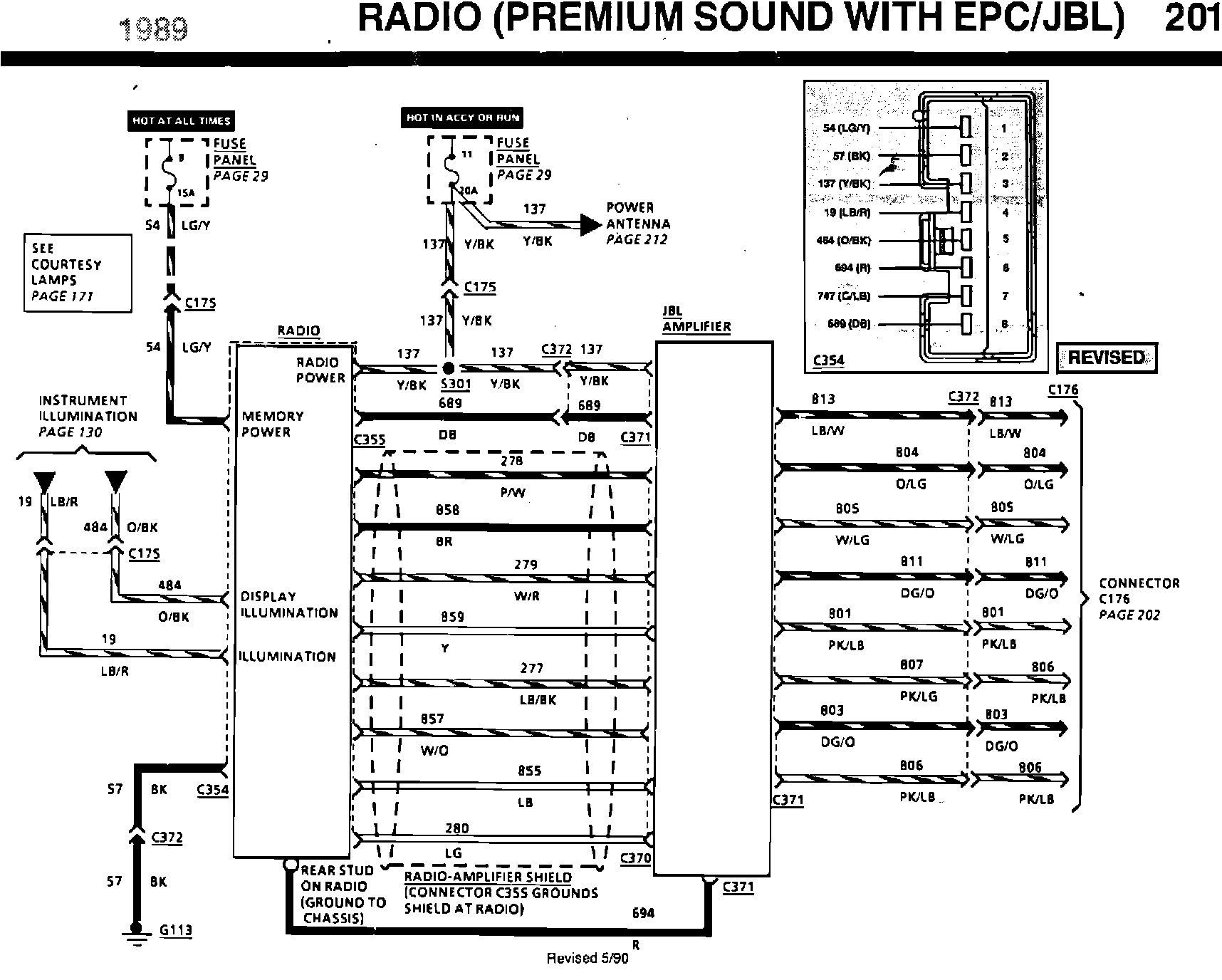 ISSUE: The radio connector # 354 pinouts, of the Premium Sound with EPC/JBL, on pages 201 and 204 of the 1989 Taurus/Sable EVTM are incomplete.