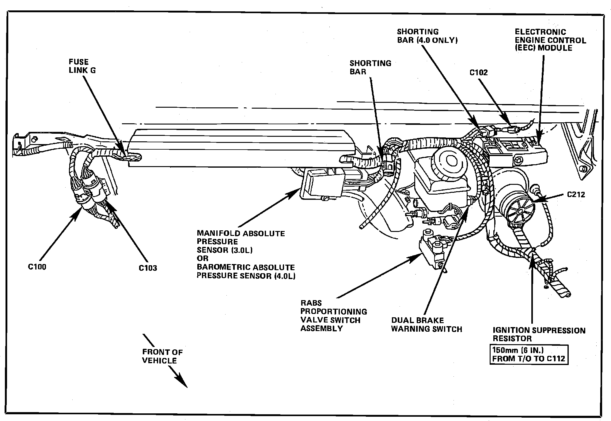 The SPOUT connector shorting bar, is located at the LH rear of the engine compartment on the passenger side of master cylinder.
