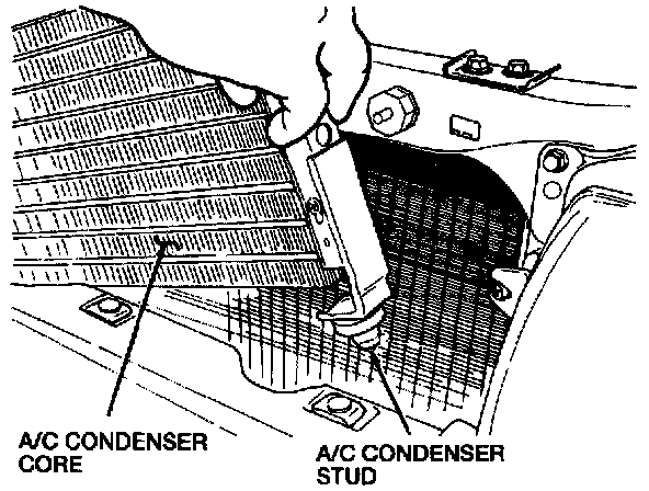 4. Remove routing clamp bolt securing high-pressure hose to condenser bracket, then remove two bolts securing top of hood latch and center brace.