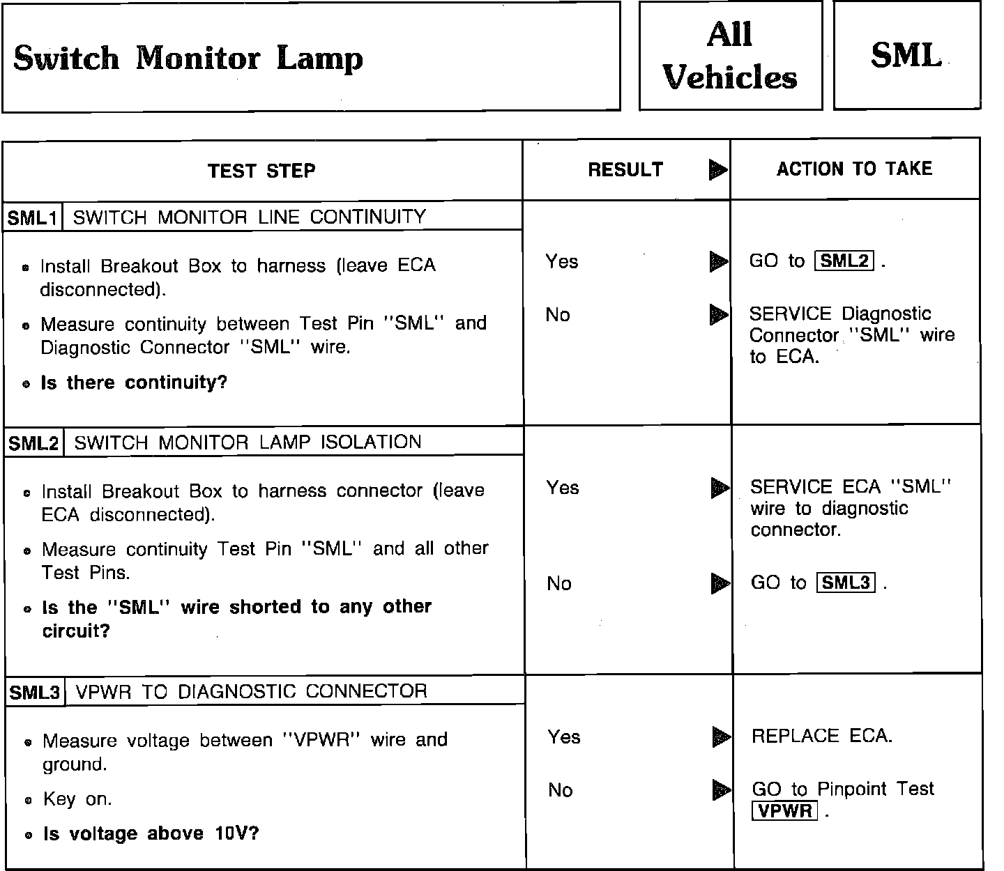 Pinpoint Test SML1 Thru SML3 - Switch Monitor Lamp: