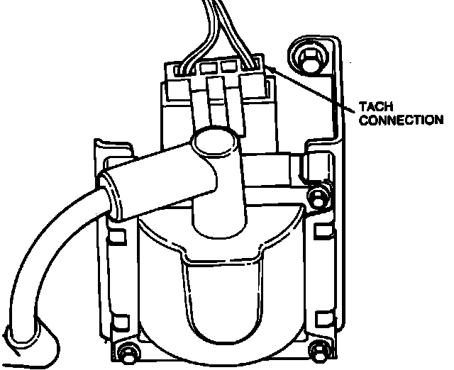 ^ It is important to get a good, solid connection from the tachometer connection during testing. Note location of proper terminal and use an alligator clip, without removing the coil connector. This is accomplished by inserting the clip into the back of the connector, onto the dark green/yellow dotted wire.