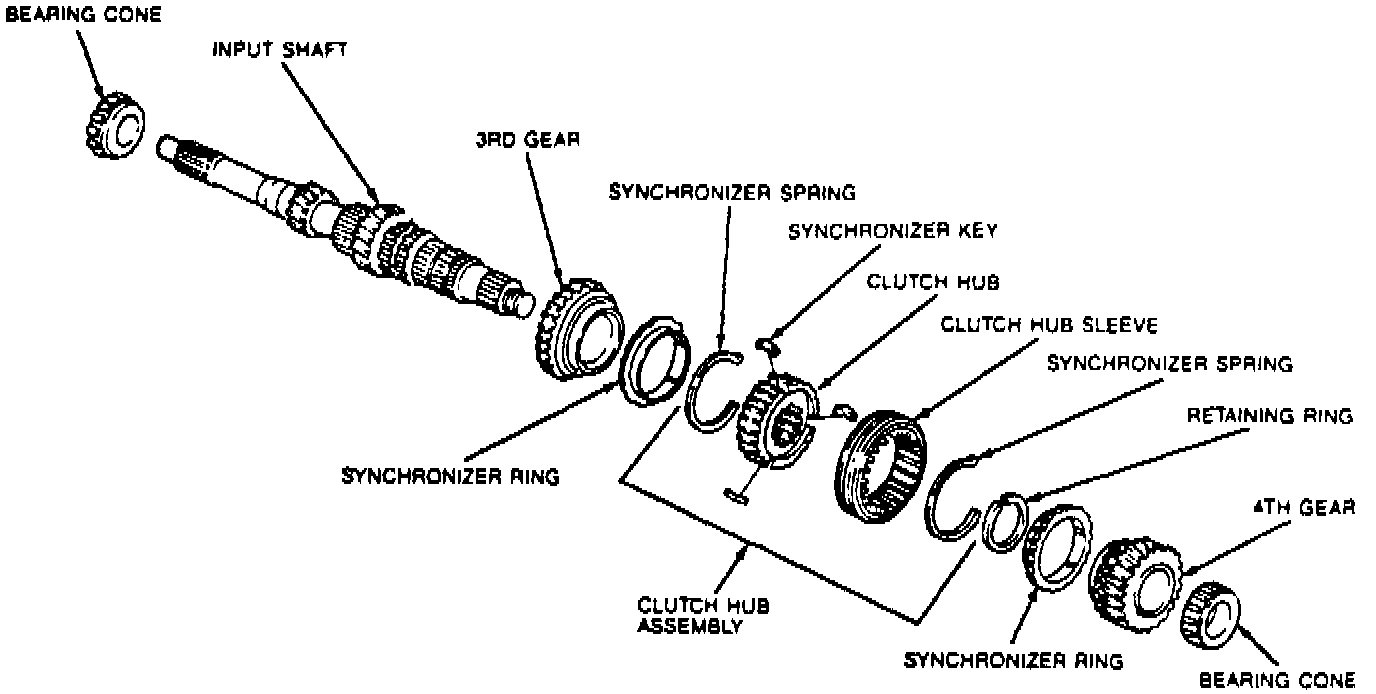 1. Press off bearing cone from 4th gear end using shaft protector D80L-625-4 and bearing pulling attachment-D84L-1123-A or equivalents.