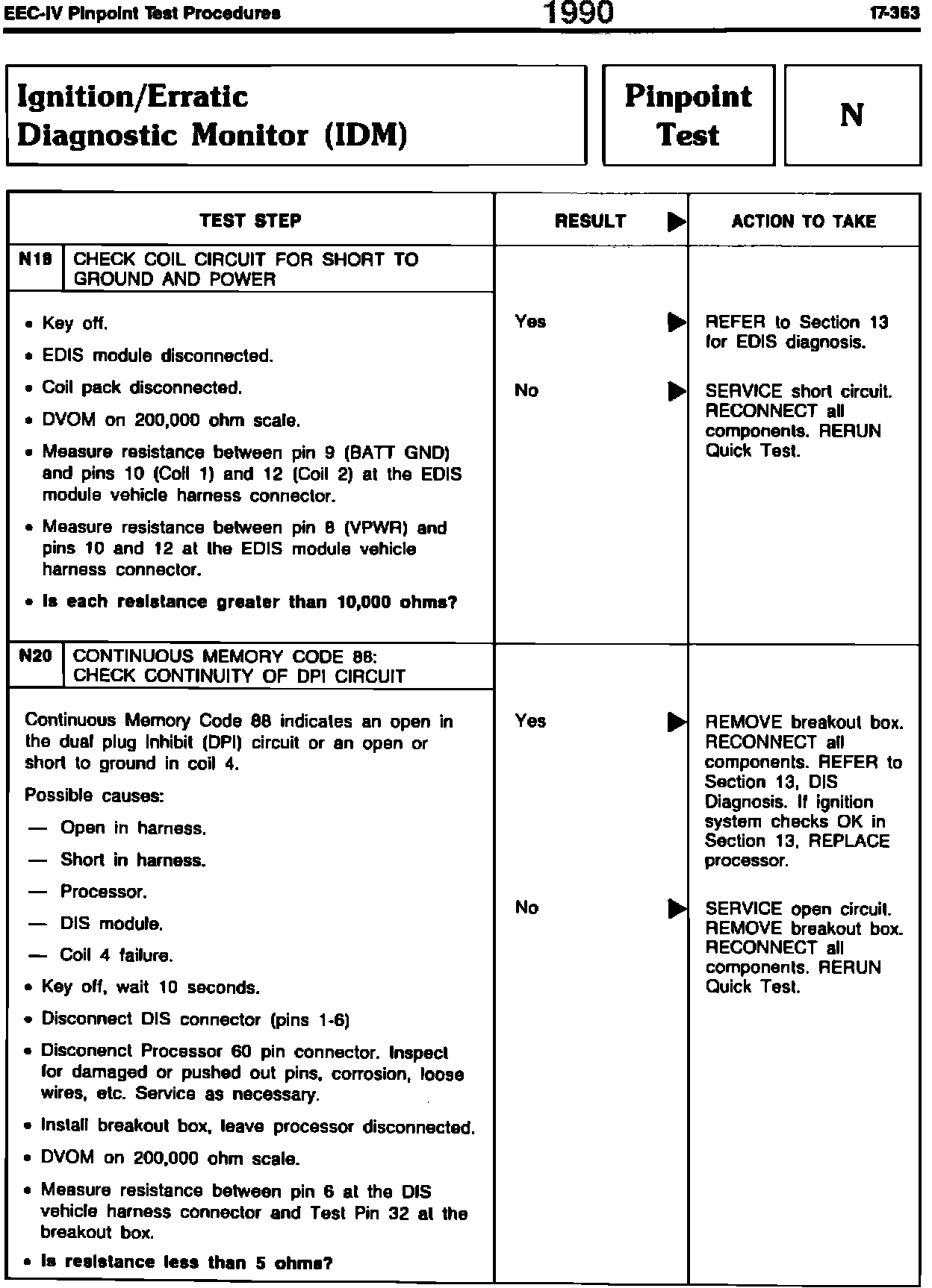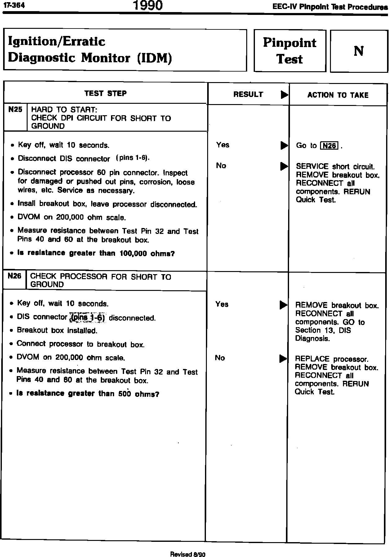 ISSUE: The DSI connector pins 7-12 indicated on page 17-364 of the Ignition/Erratic Diagnostic Monitor (IDM) Pinpoint Test N in the 1990 Engine/Emissions Diagnosis Shop Manual are incorrect. The correct pins are 1-6.