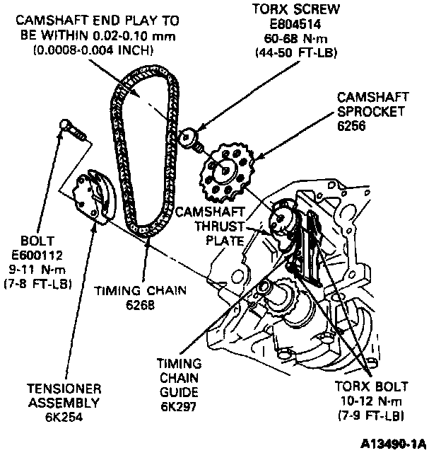 6. Install the camshaft sprocket retaining bolt, and tighten to 60-68 Nm (44-50 ft lb).