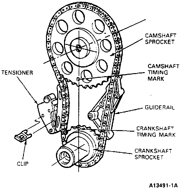 NOTE: Make sure that the tensioner side of the timing chain is held inward, and that the guide side of the chain is straight and tight.