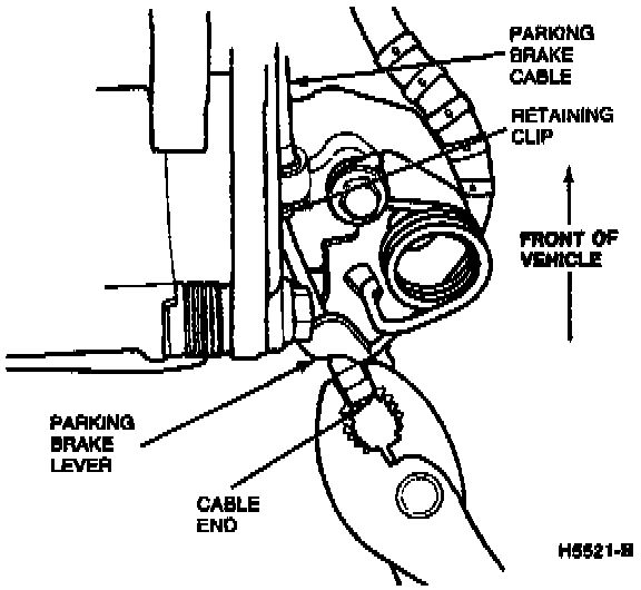 3. Remove retaining clip from parking brake at caliper. Disengage parking brake cable end from lever arm.