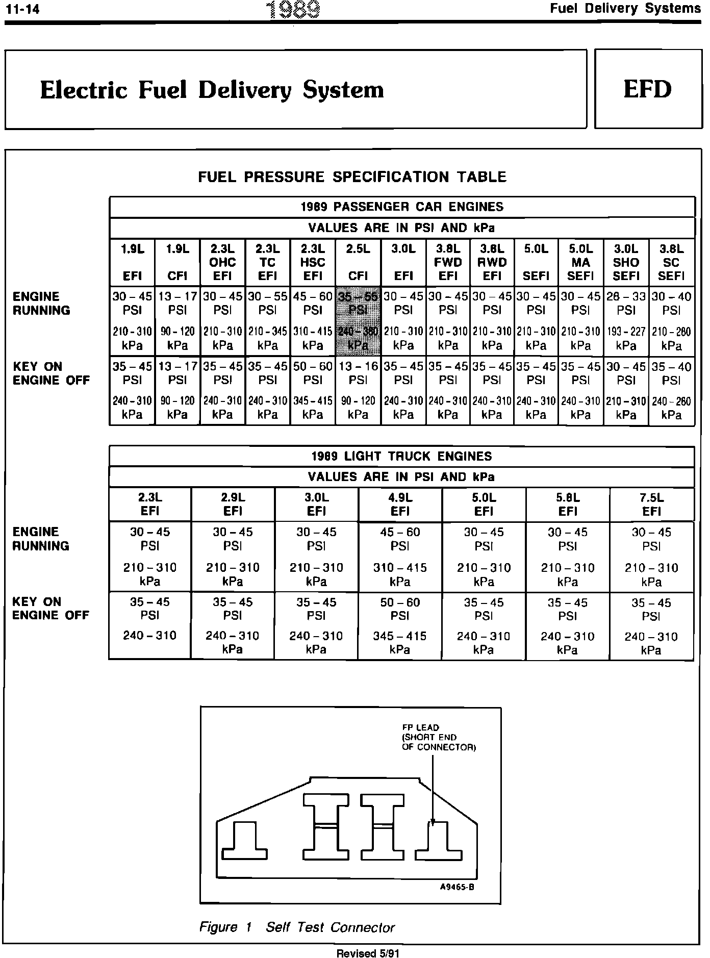 ^ ENGINE/EMISSIONS DIAGNOSIS MANUAL - 1989 - PAGES 11-14 AND 17-185 - FUEL PRESSURE SPECIFICATIONS REVISED