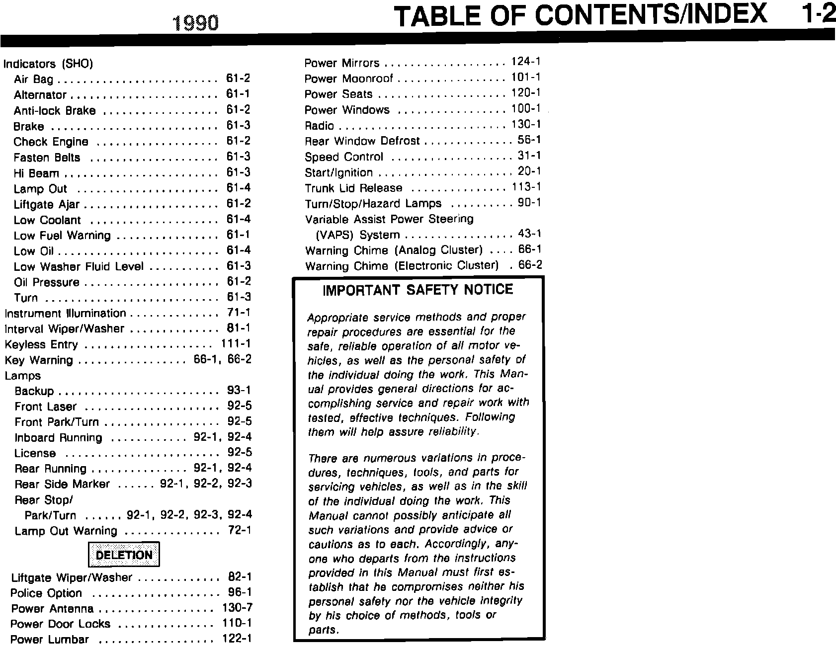 ^ ELECTRICAL/VACUUM TROUBLESHOOTING MANUAL - 1991 - PAGE 1-2 - REFERENCE TO REMOTE LIFTGATE RELEASE DELETED